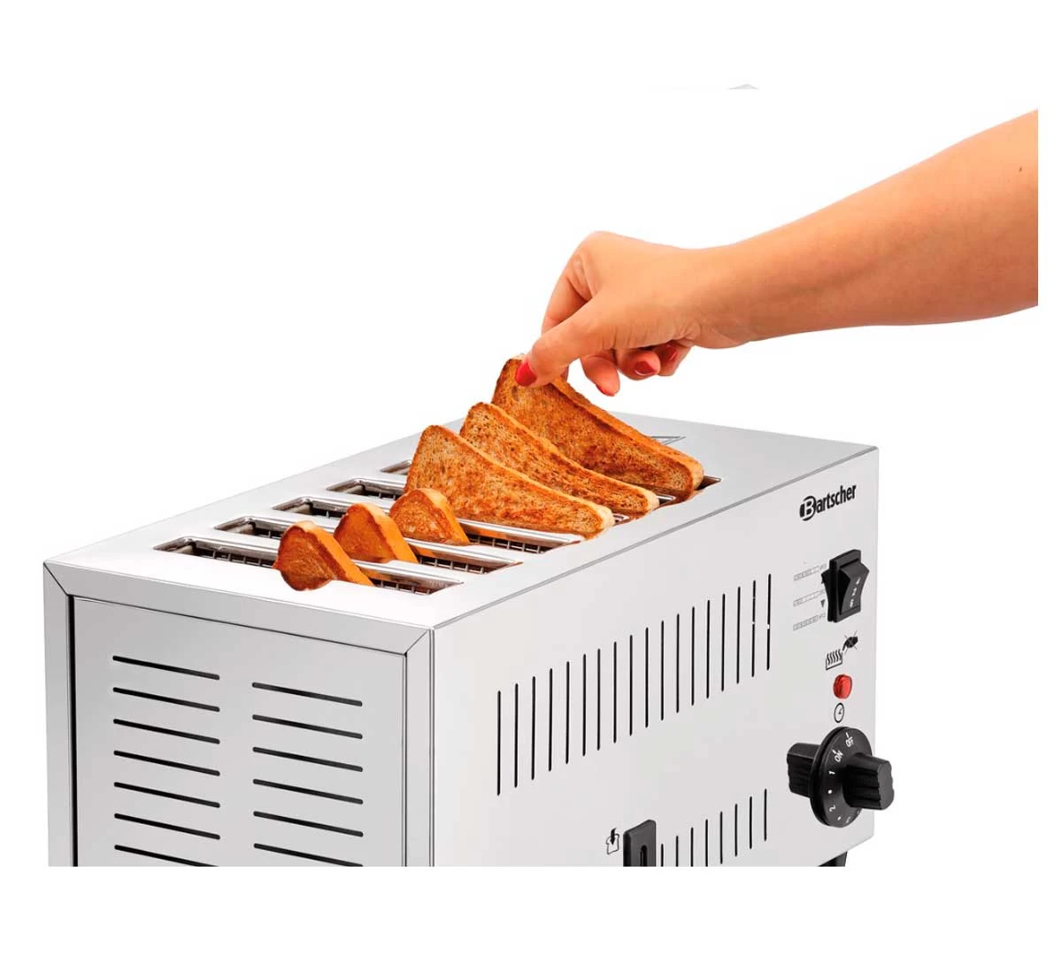El Tostador TS60 de Bartscher tiene 6 ranuras. Con el interruptor de selección se puede elegir la cantidad de ranuras que se quieren poner en marcha (2, 4 o 6 ). El temporizador permite ajustar el grado de tostado.