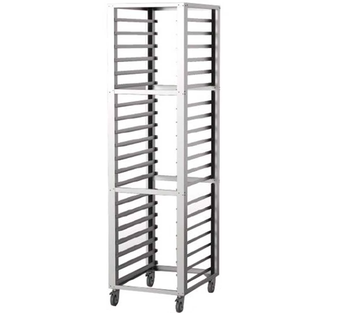Este carro porta bandejas está diseñado con 20 niveles y tiene capacidad para bandejas de diferentes tamaños, según el modelo. Tiene 4 ruedas de 12,5 cm de diámetro que facilitan su traslado, dos de ellas con freno.