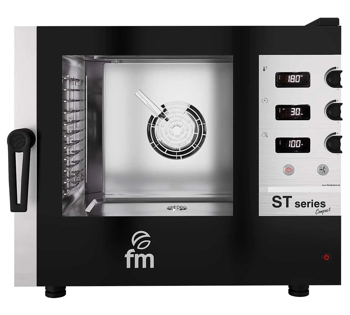 El Horno Mixto Eléctrico STC 611 EW de FM funciona con mando analógico muy fácil de usar y la posición de la bandeja es transversal. Tiene una capacidad para 6 bandejas GN 1/1.