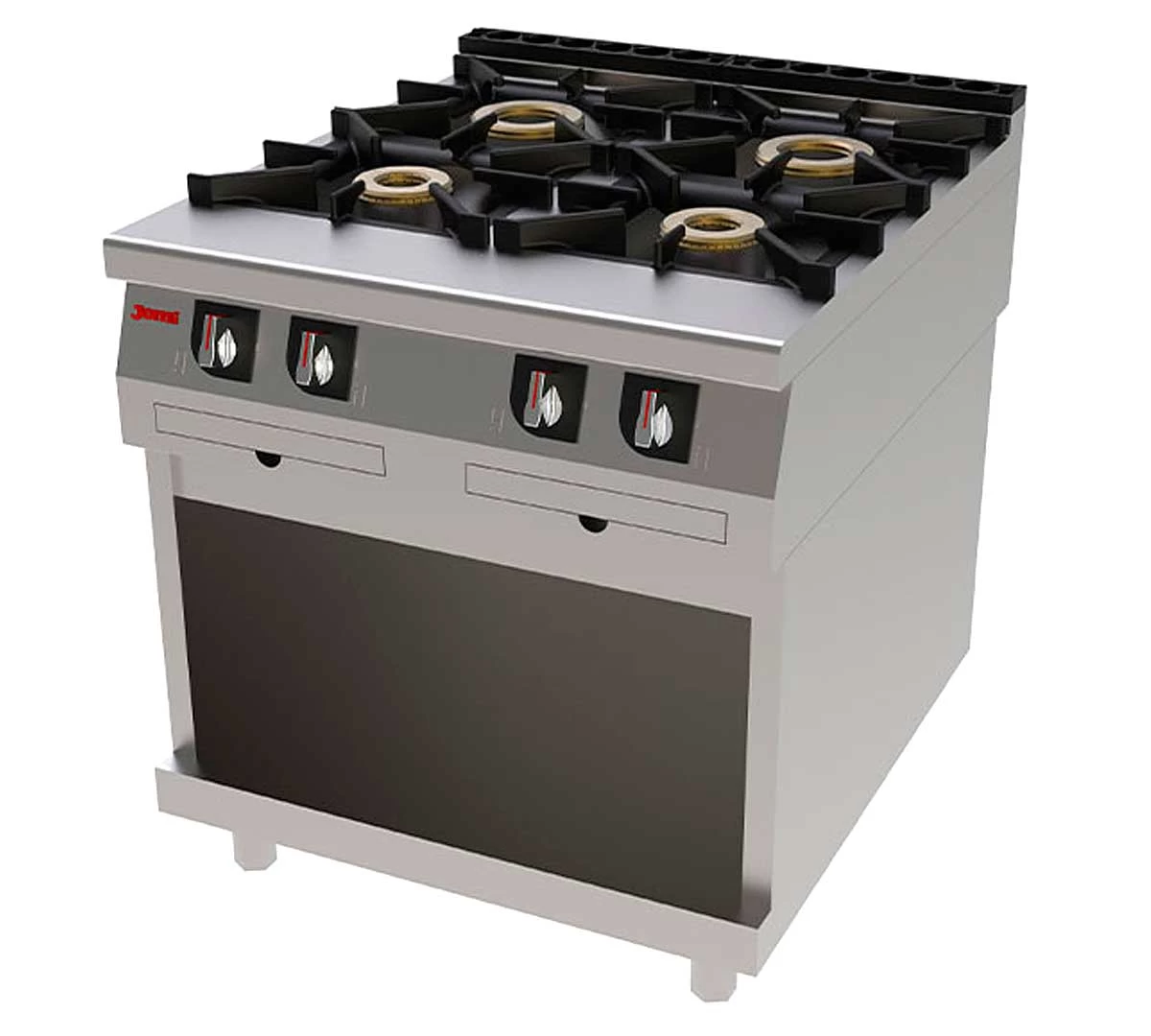 - T401, con 4 fogones, 2 de 7,4 kW y 2 de 8,4 kW, y unas dimensiones de 80 x 90 x 85 cm. 30,35 kW de potencia y 27.000 Kcal/h.