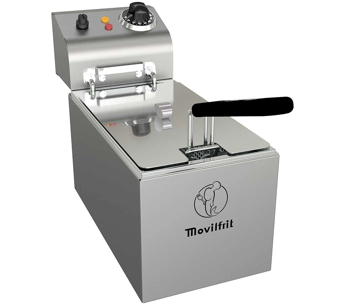 Freidora FA de Movilfrit fabricada en acero inoxidable con resistencia blindada y termostato de seguridad. Disponible con 4, 6, 8 o 9 litros de capacidad.