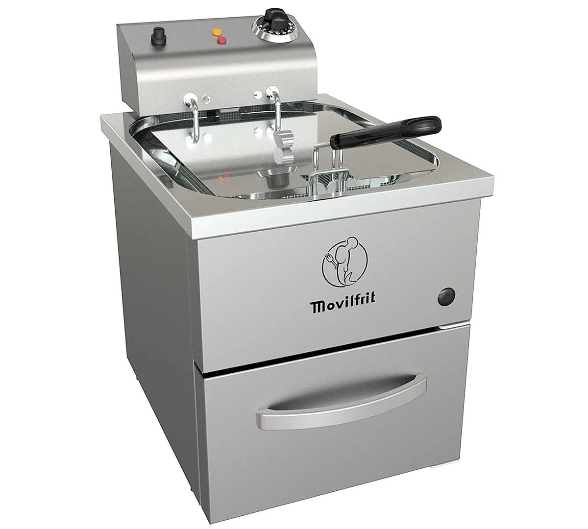 La Freidora FP10 de Movilfrit, utiliza un sistema de agua y aceite, esto permite que el aceite dure más tiempo, ahorre energía y se puede freir sin mezclar los sabores.