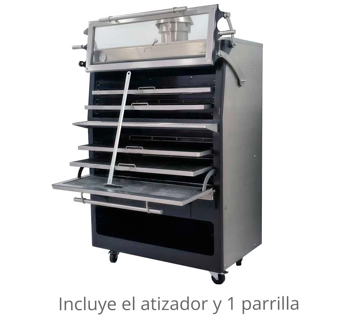 - Equipado con termómetro, cortallamas y regulador de tiro interno, listo para funcionar desde el primer momento, situándolo únicamente bajo una campana.