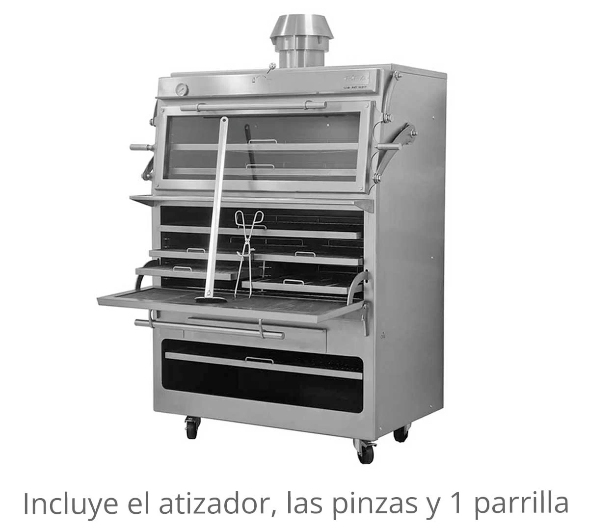 - Equipado con termómetro, cortallamas y regulador de tiro interno, listo para funcionar desde el primer momento, situándolo únicamente bajo una campana.