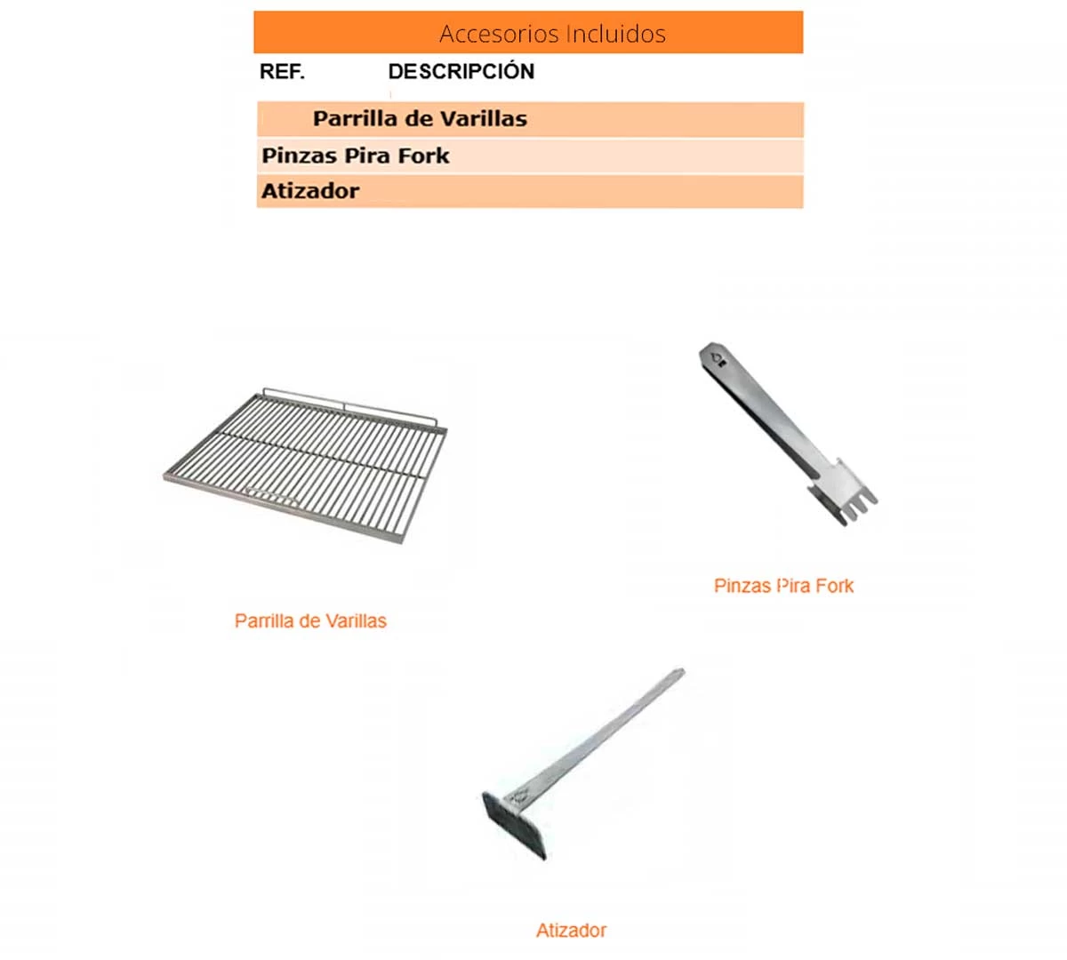Incluye de serie un atizador y unas pinzas para carne además de una parrilla de varilla estándar.