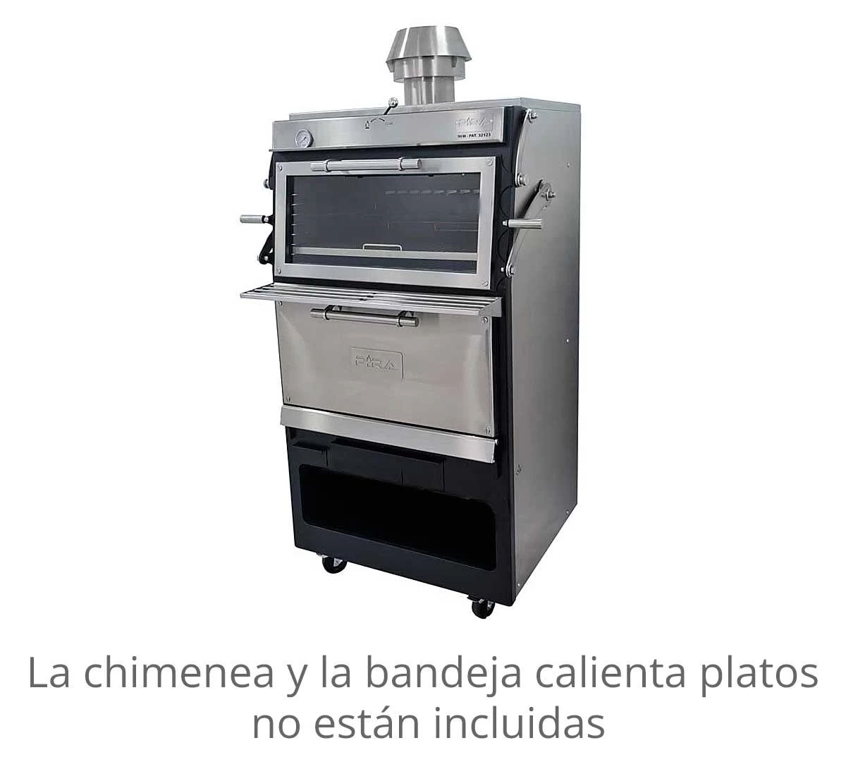 - Equipado con termómetro, cortallamas y regulador de tiro interno, listo para funcionar desde el primer momento, situándolo únicamente bajo una campana.
