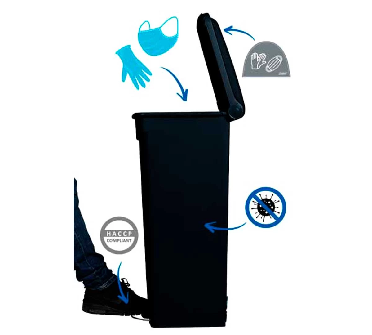 El Cubo de Basura con Tapa, Pedal y Ruedas Antrimicrobiano de Probbax es perfecto para la recogida fácil y sin contacto de mascarillas, guantes o cualquier otro equipo de protección contra el COVID 19.
