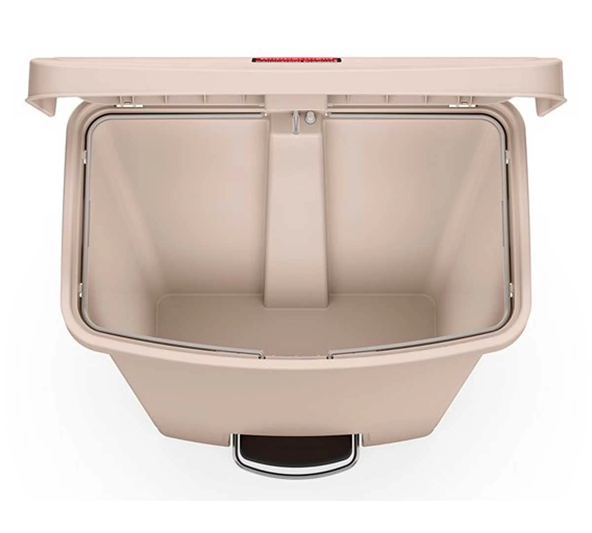 El Contenedor Slim Jim Pedal Frontal 68 litros de Rubbermaid está diseñado para ahorrar espacio. Tiene banda de sujeción para bolsas y diseño con bisagra interna que evita daños en las paredes.