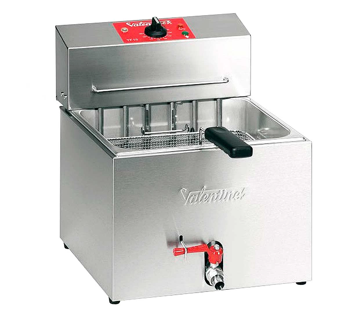 Freidora Serie TF-10 de Valentine, fabricada en acero inoxidable y equipada con termostato de seguridad con botón de rearme.